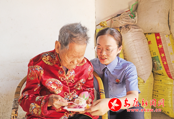 原來,當天是她的101歲生日,嵐皋縣檢察院的檢察干警和藺河鎮(zhèn)的干部、附近的村民們一起上門,為她慶祝生日。