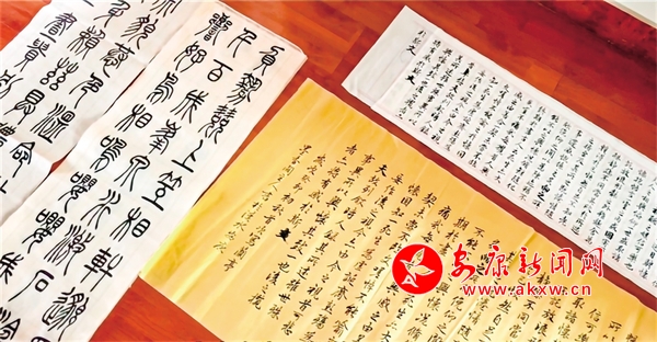大概在他24歲那年,郭榮高就不再求人寫字了,書法和碑刻一整套工作流程都能獨(dú)立完成,工作之余,他開始潛心研究更多的字體。“顏體氣勢恢宏,寫對(duì)聯(lián)這些大字很有氣勢。寫得時(shí)間長了又喜歡柳體,很精神、有風(fēng)骨。但是又發(fā)現(xiàn)沒有功底,柳體的字寫大了就不好看。后來又寫歐陽詢的字——用現(xiàn)在話說,就是楷書天花板?瑫鴮W(xué)了七八年以后我才接觸到隸書。”從楷書、隸書,再到草書,每學(xué)一種字體,郭榮高都要了解這種字體出現(xiàn)的年代及當(dāng)時(shí)的人文歷史。Add安康新聞網(wǎng)