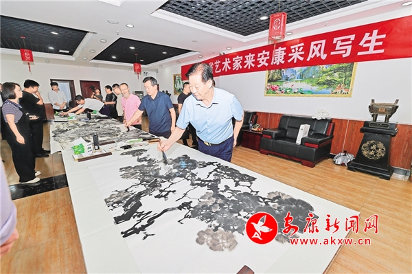當(dāng)日,“心向青山綠水”主題引起了藝術(shù)家們的共鳴,大家紛紛以此為主題創(chuàng)作了一幅幅生動(dòng)的美術(shù)作品。筆會(huì)現(xiàn)場(chǎng),郭線廬提筆之間氣勢(shì)非凡,引得圍觀的眾人贊不絕口,整個(gè)創(chuàng)作過程如同一幅流動(dòng)的風(fēng)景。LkV安康新聞網(wǎng)