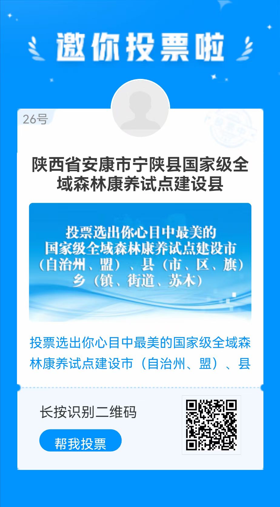 據(jù)了解,國家級森林康養(yǎng)試點建設(shè)單位認(rèn)定工作由中國林業(yè)產(chǎn)業(yè)聯(lián)合會負(fù)責(zé)開展,經(jīng)自愿申報、主管部門審核推薦、合規(guī)用地和安全經(jīng)營專項檢查、當(dāng)?shù)毓、專家審查及認(rèn)定結(jié)果全國公示等程序,確定了2023年國家級森林康養(yǎng)試點建設(shè)單位名單。同時還開設(shè)投票活動,選出大眾心目中最美的國家級森林康養(yǎng)試點建設(shè)基地和中國森林康養(yǎng)人家,請為森林履蓋率全國第一的“秦嶺之心 綠都寧陜”投上您寶貴的3票。ㄩL按二維碼即可投票,每個微信號每天可投3票)