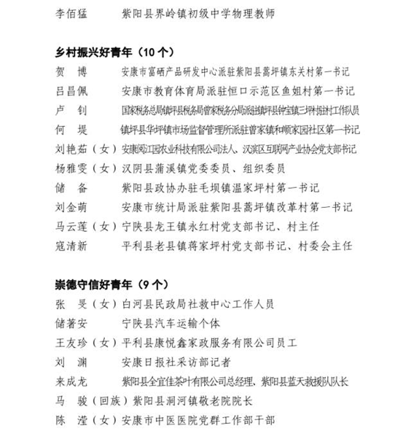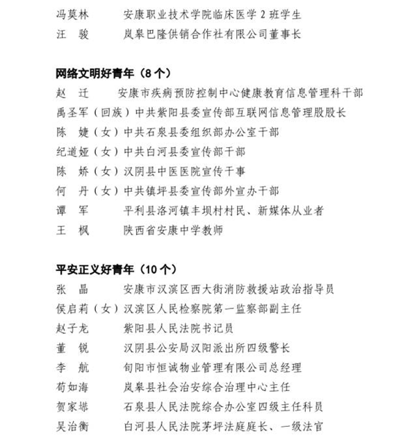 近日,由市委組織部、市委宣傳部、市委文明辦、市委政法委、市委網(wǎng)信辦、市教體局、市科技局、市民政局、市人社局、市鄉(xiāng)村振興局、市衛(wèi)健委、團(tuán)市委、市青聯(lián)共同開展的第四屆“‘中國夢(mèng)·青年志’——尋找身邊的安康好青年”主題活動(dòng)結(jié)果揭曉。