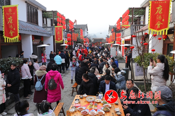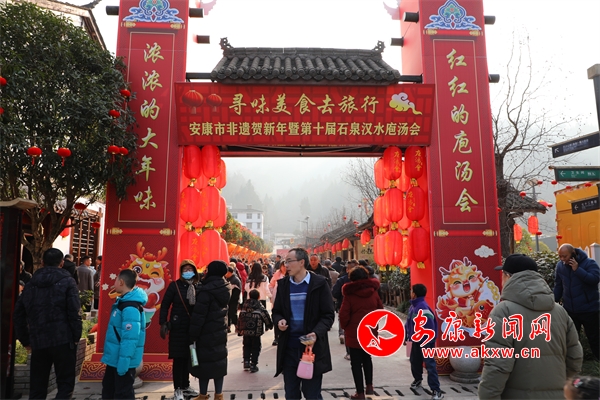 走進(jìn)石泉縣中壩作坊小鎮(zhèn),大紅燈籠高高掛,山貨特產(chǎn)來(lái)云集,洋溢著喜慶的過(guò)年氛圍。隨著打連錢、舞彩獅、抬花轎、采蓮船等民俗展演活動(dòng)開始,中壩文化休閑廣場(chǎng)上人山人海,熱鬧非凡。陜北民歌手、安康小場(chǎng)子、漢調(diào)二黃等非遺傳承“文化走親”活動(dòng),更是給廣大游客和城鄉(xiāng)群眾帶來(lái)豐富多彩的文化體驗(yàn)。“上菜嘍——”隨著一聲長(zhǎng)長(zhǎng)的吆喝聲,最具年俗特色的庖湯宴開始了,方桌板凳擺長(zhǎng)街,用剛剛宰殺的新鮮豬肉烹飪出的各色陜南傳統(tǒng)美食,吸引了眾多鄉(xiāng)親和游客來(lái)品嘗。