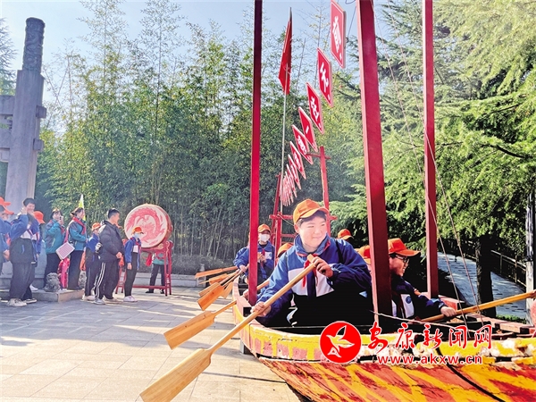 進入翠屏島景區(qū),一艘龍舟顯得格外醒目,這是中國安康第十八屆漢江龍舟賽活動中獲得第一名的冠軍船,也是瀛湖代表隊的勝利之船。登上冠軍船體驗劃龍舟,是瀛湖研學中的重要一課。“賽龍舟作為安康傳統(tǒng)文化活動,是極具特色和代表性的,讓學生體驗劃龍舟,不僅很好地傳播了地方文化,也能將龍舟精神傳遞給學生,激勵他們團結一致、勇往直前。”羅上順是陜文投安文旅公司的工作人員,同時也參與過好幾屆龍舟賽,在他的帶領下,學生們一邊喊著口號,一邊用力劃槳。“劃龍舟竟然是跪在船上的,一會工夫我的膝蓋就好疼了,那些在賽場上的選手真厲害!”同學們紛紛發(fā)出感嘆。