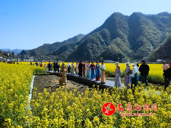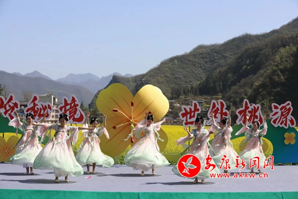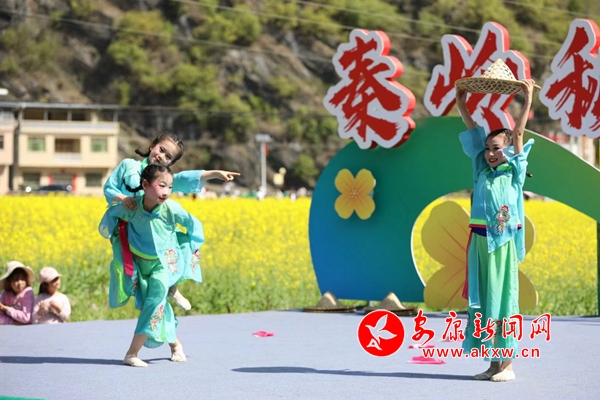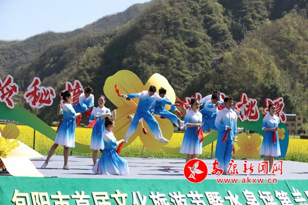 活動現(xiàn)場,旬陽市仁河口鎮(zhèn)水泉坪景區(qū)萬畝油菜花海在陽光照耀下嬌俏迷人,和煦春風拂面而來,花海泛起層層疊疊的金色浪潮,濃郁的花香令人沉醉,絡繹不絕的觀眾和游客不時駐足拍照。精彩的文藝演出更是輪番上演,歌曲《油菜花開了》《旬陽人》、表演唱《庭院經濟富農家》、舞蹈《盛世花開》《家鄉(xiāng)的油菜花》《春頌》、嗩吶獨奏《百鳥朝鳳》、音樂快板《紅色傳承譜華章》、大筒子小戲《勸賭》等節(jié)目,讓觀眾目不暇接、贊不絕口,為景區(qū)增添了文化內涵、營造了藝術氛圍、給繁花似錦的油菜花海注入了生機活力。