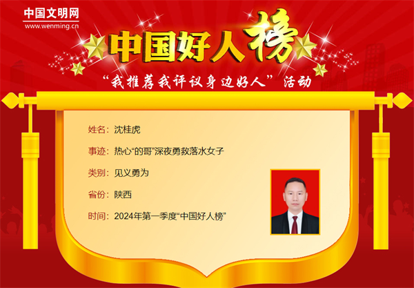 沈桂虎,男,1982年2月生,陜西省漢陰縣某公司出租車(chē)駕駛員。沈桂虎出車(chē)時(shí)路遇一女子落水,不顧危險(xiǎn)毅然跳入水中施救,女子因搶救及時(shí)脫離危險(xiǎn)。沈桂虎曾獲“陜西好人”等榮譽(yù)。