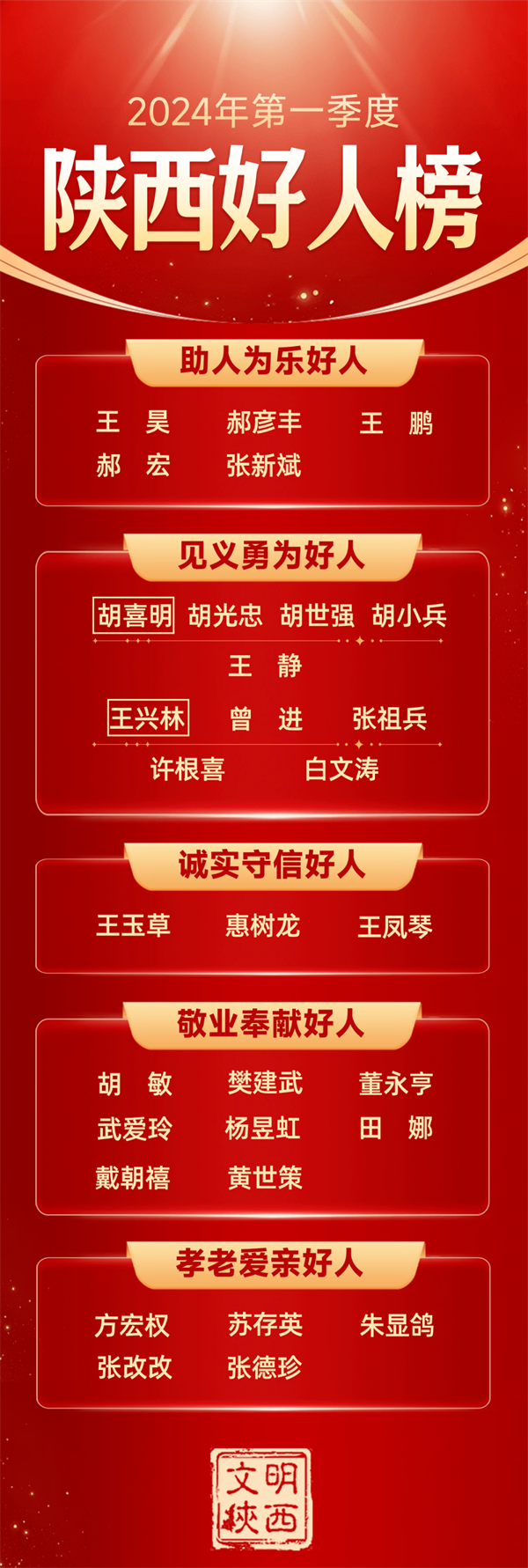 4月25日下午,2024年第一季度陜西好人榜發(fā)布儀式暨道德模范與身邊好人現(xiàn)場交流活動在西安市高陵區(qū)舉辦 。我市助人為樂好人張新斌,見義勇為好人王興林、曾進(jìn)、張祖兵,誠實(shí)守信好人王鳳琴光榮上榜,一起來看看他們的光榮事跡。