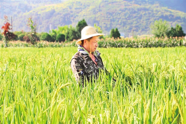 洪安喜查看水稻長(zhǎng)勢(shì)。 市農(nóng)科院供圖