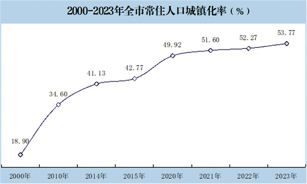 城鎮(zhèn)化步伐明顯加快。1949年,安康總?cè)丝?46.75萬人,其中農(nóng)業(yè)人口占89.4%,屬于典型傳統(tǒng)的農(nóng)村社會(huì),交通不便,人員相對(duì)封閉不流動(dòng)。改革開放后,市場(chǎng)經(jīng)濟(jì)體制逐步建立,特別是2000年撤地設(shè)市,對(duì)安康具有劃時(shí)代和里程碑的意義。2021年旬陽撤縣設(shè)市,成為陜南首個(gè)縣級(jí)市,標(biāo)志著全市城鎮(zhèn)化步伐邁向更高水平。全市抓住東部勞動(dòng)密集型產(chǎn)業(yè)向中西部轉(zhuǎn)移的機(jī)遇,依托易地搬遷集中安置點(diǎn),大力興辦新社區(qū)工廠,把農(nóng)民變?yōu)榫用,大力開展新環(huán)境、新服務(wù)、新產(chǎn)業(yè)、新民風(fēng)、新生活“五新”社區(qū)創(chuàng)建工作,完善配套設(shè)施,健全服務(wù)體系,城鎮(zhèn)化建設(shè)步伐顯著加快。2023年,全市戶籍人口300.75萬人,常住人口245.72萬人。常住人口城鎮(zhèn)化率由2000年的18.9%,提高到2023年的53.77%,23年間提高了34.87個(gè)百分點(diǎn)。