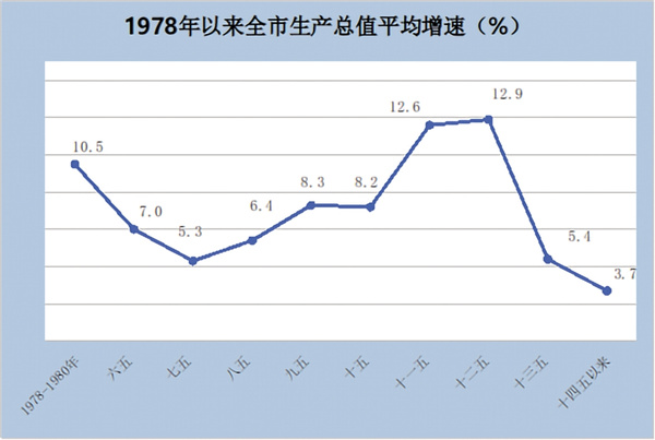 追趕超越步履堅(jiān)實(shí)。從增速看,“六五”到“十五”年均增速為個(gè)位數(shù);“十一五”“十二五”時(shí)期發(fā)展較快,年均增速兩位數(shù),“十三五”年均增長5.4%,“十四五”前三年平均增長3.7%。從具體年份看,2007—2016年連續(xù)10年保持兩位數(shù)增長,其中2012年增長15.2%。自2009年起,全市GDP增速持續(xù)高于全省平均水平,尤其是2015年躍居全省第一,2015—2019年連續(xù)5年保持全省首位,呈后來居上、追趕超越之勢(shì)。2020年受疫情沖擊,增速回落至全省第9位,2023年全市經(jīng)濟(jì)平穩(wěn)恢復(fù),增長1.7%,發(fā)展進(jìn)入新常態(tài)。