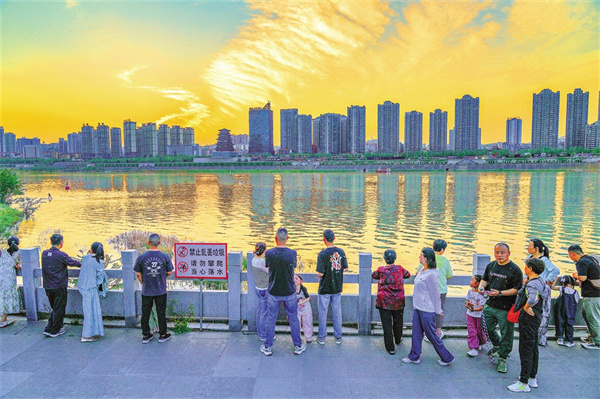 5月2日,天邊的云彩被夕陽染成了暖黃色,與江水的波光相互輝映,構成了一幅絕美的畫卷。圖為安康城區(qū)濱江公園的步道上,眾多游客在享受愜意的時光。皮勇維 攝