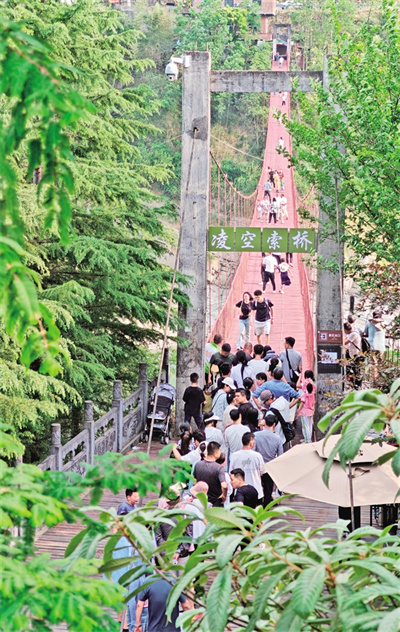 好山好水迎客來。5月3日,各地游客在紫陽縣陜甘茶馬古道景區(qū)打卡游玩。圖為游客在服務人員的引導下有序排隊,依次踏上景區(qū)內的凌空索橋。儲茂銀 攝