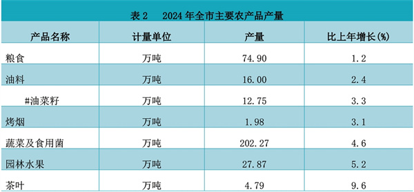 2024年,全市農(nóng)林牧漁業(yè)增加值增長(zhǎng)3.2%。其中,農(nóng)業(yè)增加值增長(zhǎng)4.5%;林業(yè)增加值增長(zhǎng)7.6%;牧業(yè)增加值下降2.3%;漁業(yè)增加值增長(zhǎng)7.0%;農(nóng)、林、牧、漁專(zhuān)業(yè)及輔助性活動(dòng)增加值增長(zhǎng)5.6%。