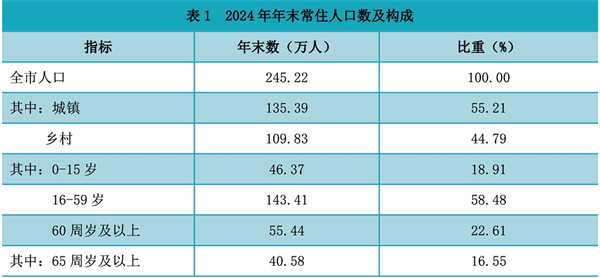 2024年末,全市常住人口245.22萬(wàn)人,比上年末減少0.5萬(wàn)人。其中,城鎮(zhèn)人口135.39萬(wàn)人,城鎮(zhèn)化率達(dá)到55.21%;鄉(xiāng)村人口109.83萬(wàn)人,占44.79%。出生人口1.69萬(wàn)人,出生率為6.89‰;死亡人口2.02萬(wàn)人,死亡率為8.24‰;自然增長(zhǎng)率為-1.35‰。