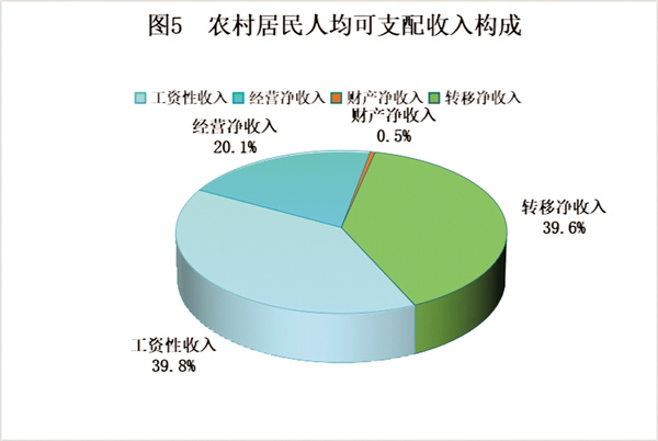 全市農(nóng)村居民人均可支配收入15434元,比上年增加1031元,增長(zhǎng)7.2%。其中,工資性收入6149元,增長(zhǎng)7.1%,占可支配收入的比重為39.8%;經(jīng)營(yíng)凈收入3104元,增長(zhǎng)6.0%,占比20.1%;財(cái)產(chǎn)凈收入77元,增長(zhǎng)12.5%,占比0.5%;轉(zhuǎn)移凈收入6104元,增長(zhǎng)7.8%,占比39.6%。