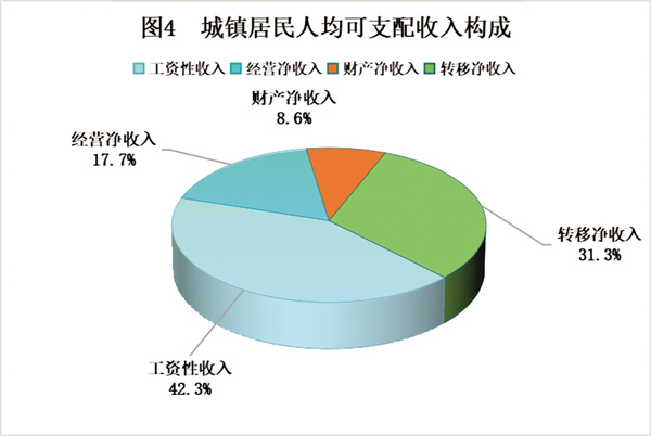 全市城鎮(zhèn)居民人均可支配收入35313元,比上年增加1674元,增長(zhǎng)5.0%。其中,工資性收入14954元,增長(zhǎng)5.5%,占可支配收入的比重為42.3%;經(jīng)營(yíng)凈收入6264元,增長(zhǎng)4.5%,占比17.7%;財(cái)產(chǎn)凈收入3028元,增長(zhǎng)4.1%,占比8.6%;轉(zhuǎn)移凈收入11067元,增長(zhǎng)4.9%,占比31.3%。