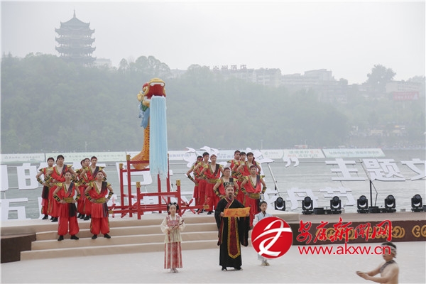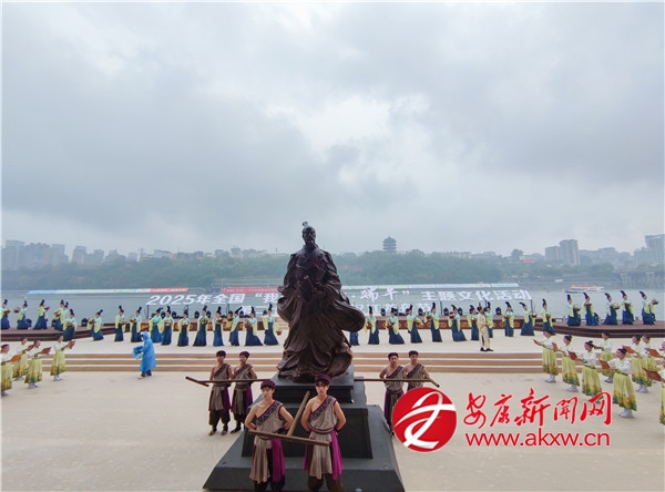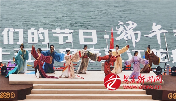 活動(dòng)現(xiàn)場(chǎng),6聲渾厚鐘聲劃破長(zhǎng)空。“緬懷先賢……”隨著主祭官畫外音傳來(lái),60名身著青綠漢服的女子手捧香粽菖蒲,踏古琴清音翩躚而出。屈原塑像被緩緩護(hù)送入舞臺(tái)中央,112名身著漢服的學(xué)童齊聲詠?lái)灱牢牡穆暲嗽诮痘厥。隨著粽拋碧波,香囊、梔子花贈(zèng)客,流淌千年的龍舟文化,化作平安順利、幸福安康的當(dāng)代回響。