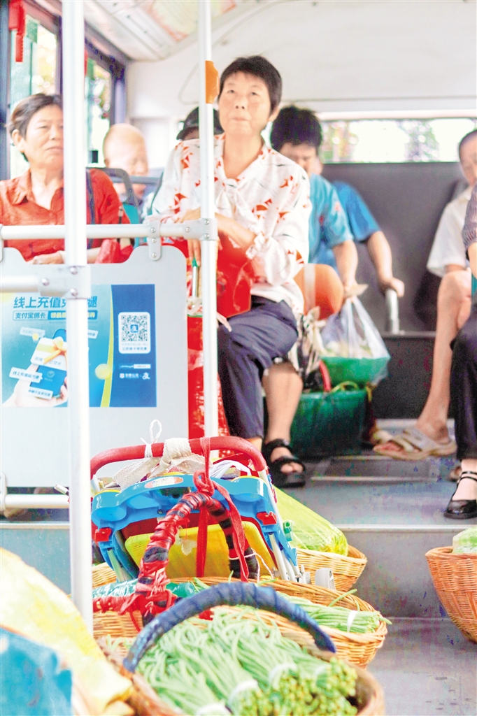 記者在途中看到,狹小的車(chē)廂內(nèi),滿是帶著露珠的新鮮蔬菜,還有公交駕駛員不厭其煩的服務(wù)態(tài)度。菜農(nóng)緊挨著自己的竹筐坐在車(chē)內(nèi),迎著漫天霞光,將大包小包的蔬菜送向城市餐桌,這是他們的日常,唯一不同的是有了接他們進(jìn)城的“專車(chē)”。