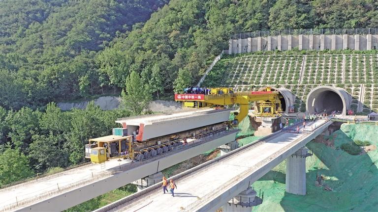 西康高鐵跨關(guān)中環(huán)線立交特大橋最后一孔箱梁架設(shè)現(xiàn)場(chǎng)(7月28日攝)。7月28日,隨著架橋機(jī)將一孔長(zhǎng)32.6米、重431.75噸的箱梁平穩(wěn)落在西康高鐵跨關(guān)中環(huán)線立交特大橋……