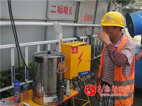 7月19日9時,記者來到巴山東路工地上,早晨的太陽已經(jīng)曬得人睜不開眼,工地上挖掘機轟隆作響,偶爾刮過一絲微風也參雜著滾燙的熱氣。也許是因為城市柏油路本就吸熱,翻開的土壤更是干燥,有的土粒透過褲管扎在腿上,也會隱隱作痛。修路工人們有的撩起衣角,有的只穿一件反光背心,埋著頭干活,有的抱著水壺酣暢痛飲,咕咕咚咚就是一大瓶水。施工方項目負責人李偉告訴記者,為避免高溫作業(yè),中午12時至下午15時會適當調(diào)整工人休息。