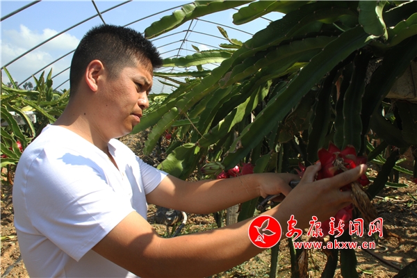 王浩家有二十多畝地用來(lái)種植紅心火龍果,坡上一個(gè)大棚,坡下三個(gè),優(yōu)良的光照條件讓這里成熟的火龍果皮薄、肉厚、果汁充盈。據(jù)了解,火龍果的生長(zhǎng)周期為當(dāng)年7月到次年2月,只要悉心種植,可20年不換種苗連續(xù)掛果。“今年雨水充沛,氣溫也正合適,預(yù)計(jì)可產(chǎn)2萬(wàn)斤,喜歡的朋友可以過(guò)來(lái)采摘“,王浩站在被紅艷艷的火龍果塞得滿滿當(dāng)當(dāng)?shù)拇笈锢,喜滋滋地說(shuō)到。