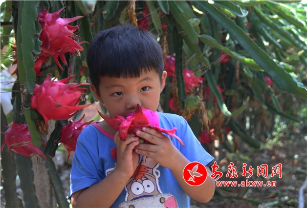 此時(shí)的王家臺(tái)村早已沒(méi)有了車水馬龍,而這里更有種“悠然見(jiàn)南山“的清新灑脫。微風(fēng)習(xí)習(xí),陽(yáng)光正好,王浩家的小兒子在田間跑來(lái)跑去,抱著火龍果吃的正香,看到此景讓人不禁感嘆道:王家臺(tái)的火紅豐收季,到了。