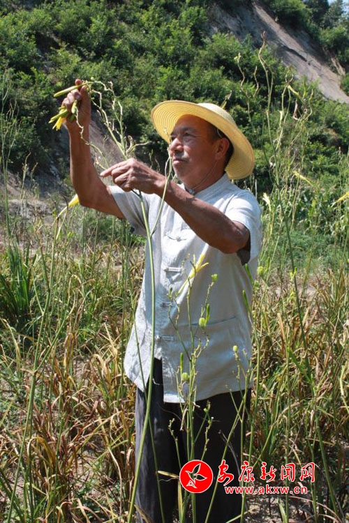 邊介紹著趙德友轉身拿來草帽,引著記者前往“讓他高興”的一畝二分地黃花地,邊走邊說:“今年黃花菜還沒有進入豐產(chǎn)期,所以自家也種了玉米、花生等作物,有時候也忙不過來,我和老伴兒呢,早上4點多就起床,不到5點就打著手電到地里除雜草、防蟲。想著明年才能到豐產(chǎn)期,也就沒怎么施肥,但沒想到今年6月開始黃花盛開,想著老兩口就能摘得過來,沒想到了后來不得不找鄰居幫忙摘花。”