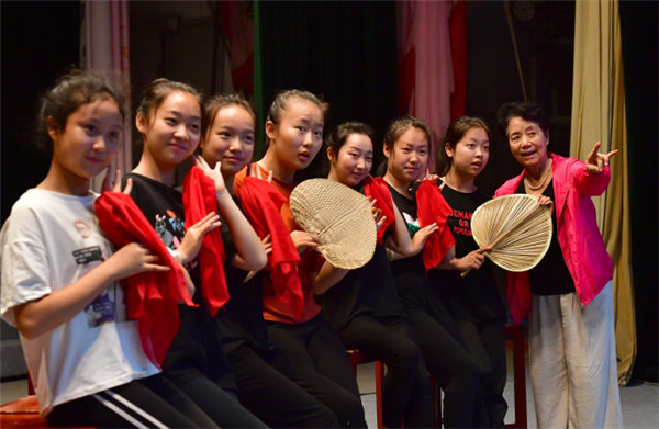 9月12日,漢調(diào)二黃國(guó)家級(jí)傳承人王發(fā)蕓(中)在向“童子班”學(xué)員示范劇目中的動(dòng)作。