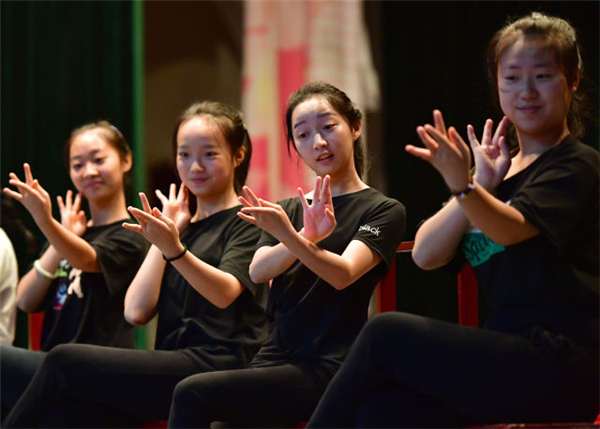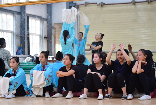 9月12日,“童子班”學(xué)員在練功房?jī)?nèi)觀摩同學(xué)排練。