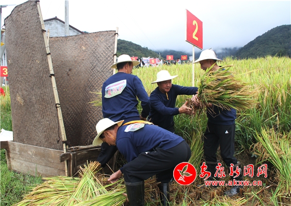 隨著一聲響亮的哨令,來自全縣12個鎮(zhèn)12支參賽隊(duì)伍展開了一場熱火朝天的田間打谷賽。割稻、打谷、捆扎、計(jì)時、稱重……隊(duì)員動作嫻熟,氣氛緊張激烈。歷經(jīng)2個小時的激烈比賽,全縣12個鎮(zhèn)打谷共計(jì)3100斤,南宮山鎮(zhèn)獲得冠軍。