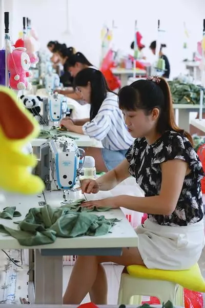 紫陽縣蒿坪鎮(zhèn)雙星社區(qū)工廠的女工在縫制毛絨玩具。記者 趙晨攝