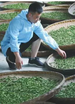 紫陽縣煥古鎮(zhèn)大連村的茶農(nóng)正在曬制白茶。 記者 趙晨攝