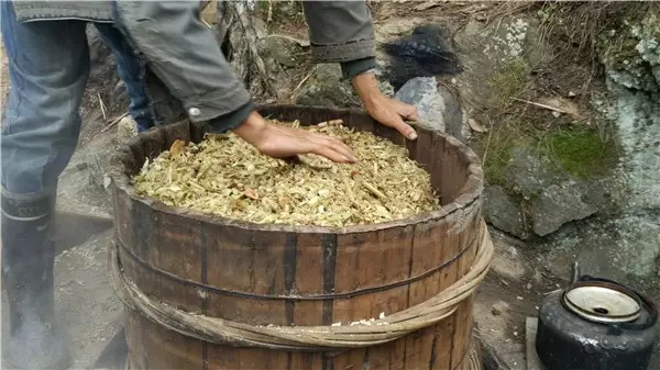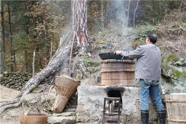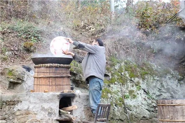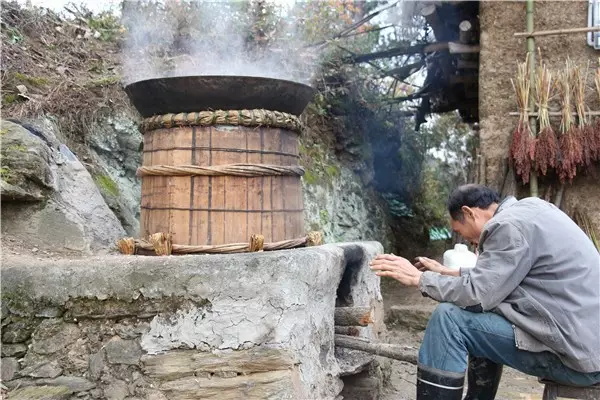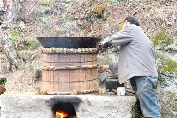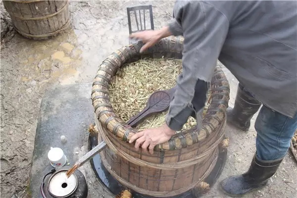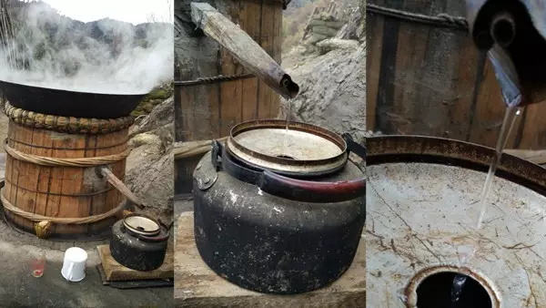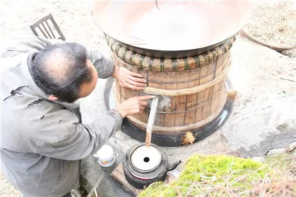 燒火的人要注意觀察火勢(shì)的大小,留心酒糟翻騰的泡泡,不時(shí)用手測(cè)測(cè)上面鐵鍋里水的溫度。上面鐵鍋里的水總在不斷升溫。大概到三十度的時(shí)候就要舀出來(lái),重新注入涼水。否則就不能起冷凝作用,蒸騰上去的酒會(huì)跑掉。