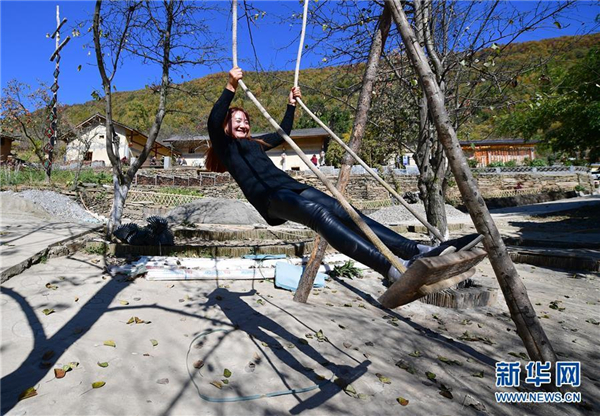 10月29日,漢濱區(qū)茨溝鎮(zhèn)西溝村村民屈南方在村子的小廣場(chǎng)上蕩秋千。 新華社記者邵瑞攝