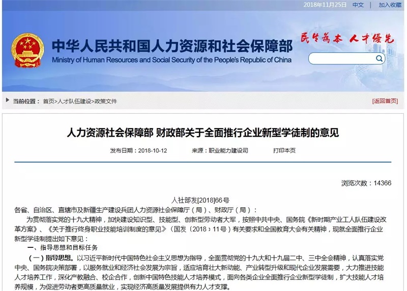 日前,人社部、財(cái)政部共同印發(fā)《關(guān)于全面推行企業(yè)新型學(xué)徒制的意見》。跟小編一起來(lái)看看,國(guó)家對(duì)企業(yè)新型學(xué)徒制的支持!
