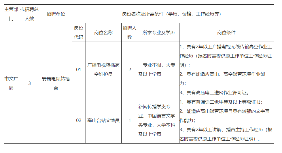 一、招聘崗位及人數(shù):廣播電視轉(zhuǎn)播高空維護(hù)員2人、高山臺(tái)站文博員1人,具體招聘崗位人數(shù)和條件要求詳見(jiàn)《安康電視轉(zhuǎn)播臺(tái)特殊崗位人才招聘崗位一覽表》(附后)。