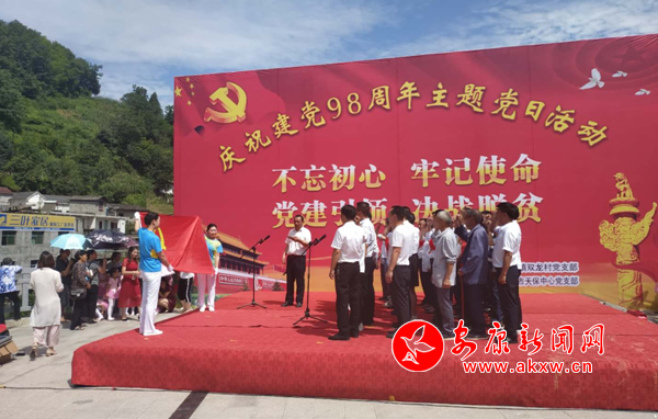 “我志愿加入中國共產(chǎn)黨,擁護(hù)黨的綱領(lǐng),遵守黨的章程......為共產(chǎn)主義奮斗終生,隨時(shí)準(zhǔn)備為黨和人民犧牲一切,永不叛黨”的誓言整齊劃一、擲地有聲。大合唱——《沒有共產(chǎn)黨就沒有新中國》激情昂然、帶動(dòng)氣氛。天保中心職工一首獨(dú)唱——《再唱山歌給黨聽》,讓場(chǎng)下很多黨員干部產(chǎn)生共鳴,齊聲吟唱,自編茶藝節(jié)目——《繡紅旗》,掀起了大家對(duì)保護(hù)黨旗、奉獻(xiàn)革命的先輩們的無限追思,中心干部一起自編自演的“決戰(zhàn)脫貧雙龍村”三句半更是把整場(chǎng)活動(dòng)推向了高潮。