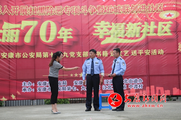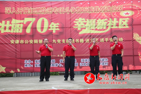 此次活動由安康市公安局、安康日報社、漢濱區(qū)江北辦事處主辦,市公安局機關(guān)第七、第九黨支部、江北文化站、中渡村承辦,旨在充分發(fā)揮機關(guān)黨員先鋒模范作用,縱深推進(jìn)掃黑除惡專項斗爭和“五城聯(lián)創(chuàng)”工作,把“不忘初心、牢記使命”主題教育融入到“送書籍、送文藝、送平安”活動中,進(jìn)一步樹牢以人民為中心的發(fā)展思想,增強黨員民警輔警開展主題教育的思想自覺。