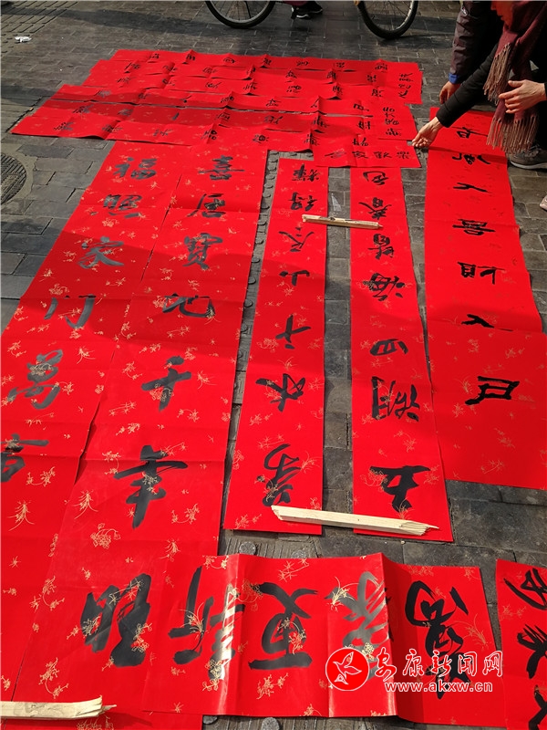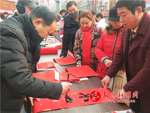 活動現(xiàn)場,人頭攢動,熱鬧非凡,駐足的老少男女,將義寫春聯(lián)的書法愛好者們圍的水泄不通,只為求得新年一副好彩頭。書桌一字排開,擺好毛筆和硯臺,書法愛好者們揮毫潑墨,書寫祝福。一幅幅行云流水、剛勁大方的春聯(lián),贏得圍觀市民的稱贊,爭相領(lǐng)取。
