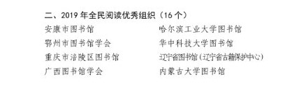 全國16個單位被評為“2019年全民閱讀優(yōu)秀組織”,其中高校圖書館4個,公共圖書館12個。安康市圖書館在2019年全民閱讀宣傳工作中,積極宣傳和踐行社會主義核心價值觀,弘揚中華優(yōu)秀傳統(tǒng)文化,組織策劃開展了“全市同讀一本書”、“全市同讀一小時”、“全市同讀一類書”等“全市同讀”系列活動,形成了全市一盤棋的業(yè)務(wù)格局,充分發(fā)揮了市館的“中心引領(lǐng)”作用,深入推進了全民閱讀工作。