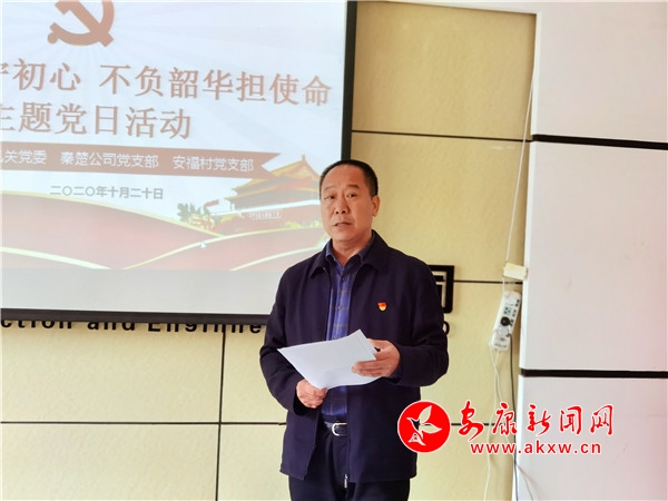 在安康秦楚建設工程有限公司,市審計局機關黨委、安康秦楚建設工程有限公司黨支部、白河縣安福村黨支部聯(lián)合開展“履職盡責守初心 不負韶華擔使命”主題黨日活動,組織廣大黨員重溫入黨誓詞,傳達學習10月11日市政府黨組(擴大)集體學習會議精神,秦楚建設工程有限公司黨支部書記、白河縣城關鎮(zhèn)安福村支部書記、市審計局機關黨委專職副書記3名黨員作交流發(fā)言;顒幼詈螅袑徲嬀贮h組書記、局長周慶意對此次活動進行現(xiàn)場點評。