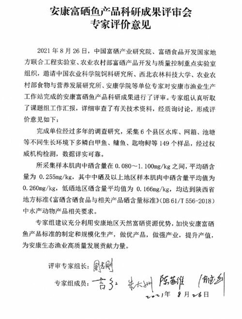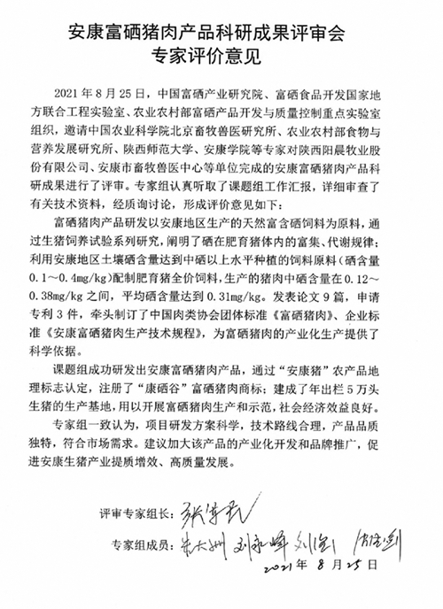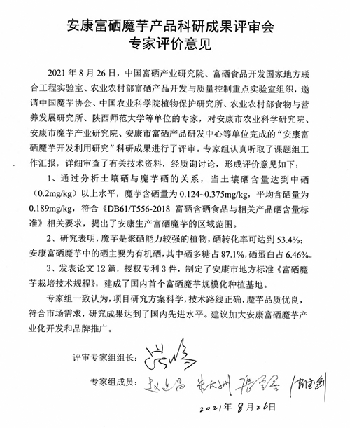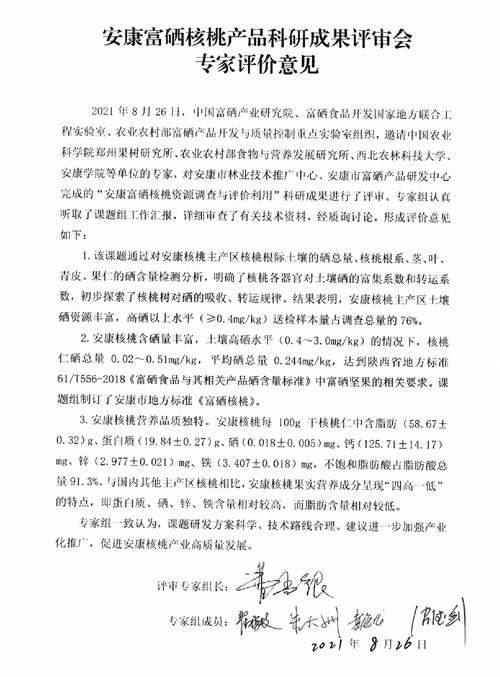 本次評(píng)審中,專家組認(rèn)真聽取了課題組工作匯報(bào),詳細(xì)審查了有關(guān)技術(shù)資料,經(jīng)質(zhì)詢討論后一致認(rèn)為:四大富硒特色產(chǎn)業(yè)課題研發(fā)方案科學(xué)、技術(shù)路線合理,研究成果達(dá)到國(guó)內(nèi)先進(jìn)水平,天然富硒是安康得天獨(dú)厚的資源優(yōu)勢(shì),培育開發(fā)出的產(chǎn)品品質(zhì)優(yōu)良,符合市場(chǎng)需求。建議充分利用安康地區(qū)天然富硒資源優(yōu)勢(shì),加快富硒特色產(chǎn)業(yè)標(biāo)準(zhǔn)的制定和規(guī);a(chǎn),做優(yōu)產(chǎn)品、做強(qiáng)產(chǎn)業(yè)、提升產(chǎn)值,加大該產(chǎn)品的產(chǎn)業(yè)化開發(fā)和品牌推廣力度,促進(jìn)產(chǎn)業(yè)提質(zhì)增效。