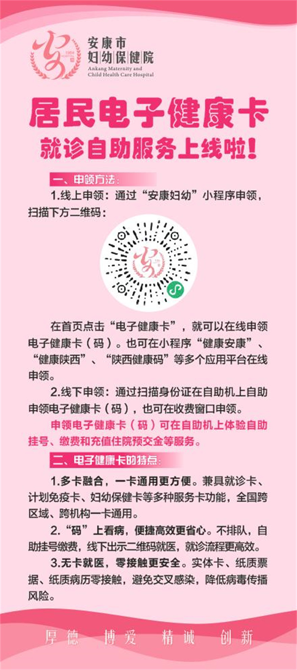 安康市婦幼保健院在醫(yī)院門診一樓大廳配備了智能醫(yī)療掛號(hào)繳費(fèi)終端,并在上線前期,組織了相關(guān)醫(yī)護(hù)人員開展操作培訓(xùn)及就診人員門診自助就診演練,同時(shí)設(shè)立電子健康卡優(yōu)質(zhì)服務(wù)導(dǎo)醫(yī)服務(wù)臺(tái)進(jìn)行推廣,引導(dǎo)就診人員使用電子健康卡(碼),并廣泛征求或收集群眾建議意見,不斷優(yōu)化電子健康卡(碼)操作流程。就診人員持二代身份證,在醫(yī)院智能醫(yī)療掛號(hào)繳費(fèi)終端、掛號(hào)窗口可申領(lǐng)紙質(zhì)健康卡(碼),也可在“安康婦幼”、“健康陜西”、“健康安康”和“陜西健康碼”等多個(gè)微信小程序應(yīng)用平臺(tái)中線上申領(lǐng)電子健康卡(碼),并可實(shí)現(xiàn)線下和線上同步掛號(hào)、就診、繳費(fèi)、取藥、查詢健康檔案等“一碼通”服務(wù)。
