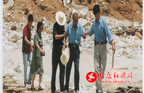 在救災的過程中,熊邦高有時會面臨生命危險。那天從石泉救災返回安康已是午后,行至一橋橋頭,熊邦高提出要去漢濱區(qū)瀛湖鎮(zhèn)查看災情(瀛湖鎮(zhèn)前幾天也遭暴雨襲擊)。當時去瀛湖鎮(zhèn)只有江南一條經(jīng)吉河向西的路,當他們乘坐的小車行至吉河往西幾公里的地方時,險情發(fā)生了!車前突然由山上滑落下一整塊比小車還大的石頭擋住了去路。車剛停下,車后的泥石流飛馳而下,截斷了后路。汽車的輪胎被埋在泥石流中,車不能動,人不能出。無助之下,他們只好先電話求救,但因泥石流阻隔,人車都無法向他們靠攏。再向市公路部門求援,待挖掘機和鏟車趕到現(xiàn)場,先清理了車后的泥石流,又用炸藥炸碎了車前的巨石,這才得以脫險。