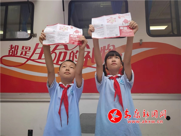 隨后,在采血車內(nèi),醫(yī)務(wù)人員從血液成分、獻(xiàn)血條件、獻(xiàn)血流程等方面為孩子們現(xiàn)場(chǎng)講解。孩子們?yōu)橹驹刚攉I(xiàn)花,表達(dá)敬意。