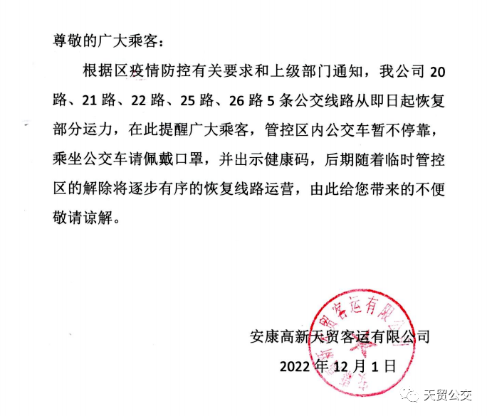 按照市道路運輸服務(wù)中心印發(fā)的《中心城市有序恢復(fù)公交、出租客運行業(yè)運輸服務(wù)工作的實施方案》要求,為更好滿足復(fù)工復(fù)產(chǎn)和市民出行需求,自12月1日12:00起,我公司1路、3路、4路、5路、9路、12路、13路、16路8條公交線路恢復(fù)營運,車輛趟次隨運營需求逐步增加,其他線路逐步有序恢復(fù)。2sh安康新聞網(wǎng)