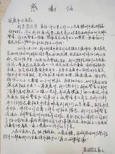 一封信,緊連著警民間的情誼;一頁信紙,書寫著群眾發(fā)自肺腑的感謝。“感謝貴局培養(yǎng)出的好警察,感謝他們愛民為民的情懷和積極擔(dān)當(dāng)?shù)淖黠L(fēng)……”近日,安康市公安局收到一封來自山東省滕州市濱湖鎮(zhèn)屈先生一家的手寫感謝信,字里行間滿是對安康市公安局漢濱分局西城派出所副所長胡龍及其同事許文波心系群眾、履職盡責(zé)、為民解憂的感激之情和贊許之意。