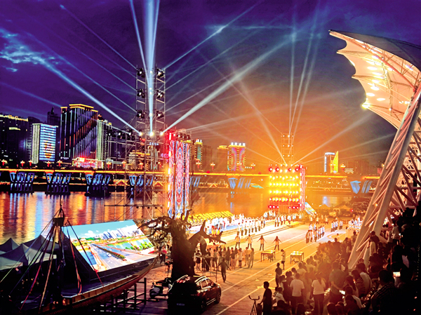 為保證第二十三屆中國安康漢江龍舟節(jié)舞臺(tái)夜間燈光照明及燈光秀,6月19日,燈光師正在加緊調(diào)試燈光。陳德模 攝hRd安康新聞網(wǎng)