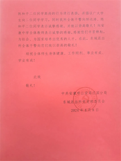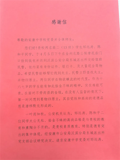 據(jù)悉,安康中學高二13班鄒遠濤、陳和平同學于4月5日下午在金州北路撿到裝有身份證件、銀行卡及大量現(xiàn)金的錢包后,積極上交公安機關(guān)并協(xié)助尋找失主。經(jīng)公安機關(guān)查找,迅速將錢包物歸原主。4月8日,漢濱分局東城派出所黨支部送來了感謝信,表揚兩位同學的高尚行為。