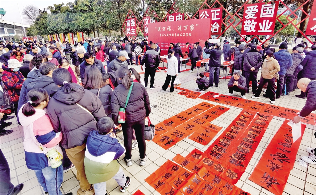 活動現場,人頭攢動,長桌一字擺開,書法家們精神飽滿,手中的毛筆飽蘸濃墨,筆鋒游走間,楷、行、隸、草等多種書體各顯神韻,一副副滿載祝福的春聯(lián)、一張張承載希望的“福”字躍然紙上,飽含著濃濃年味兒,寄托著人們對新年的美好憧憬與希望。前來領取春聯(lián)的市民絡繹不絕,大家一邊欣賞書法創(chuàng)作,一邊挑選著心儀的春聯(lián)內容,現場氣氛熱烈融洽;顒舆將在安康高新區(qū)、西城坊、部分旅游景點等地持續(xù)進行。(記者 陸青波 攝)