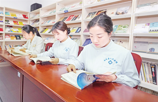4月23日,白河縣人民醫(yī)院護(hù)士利用工作間隙在圖書角專注閱讀。(伍渭康 攝)